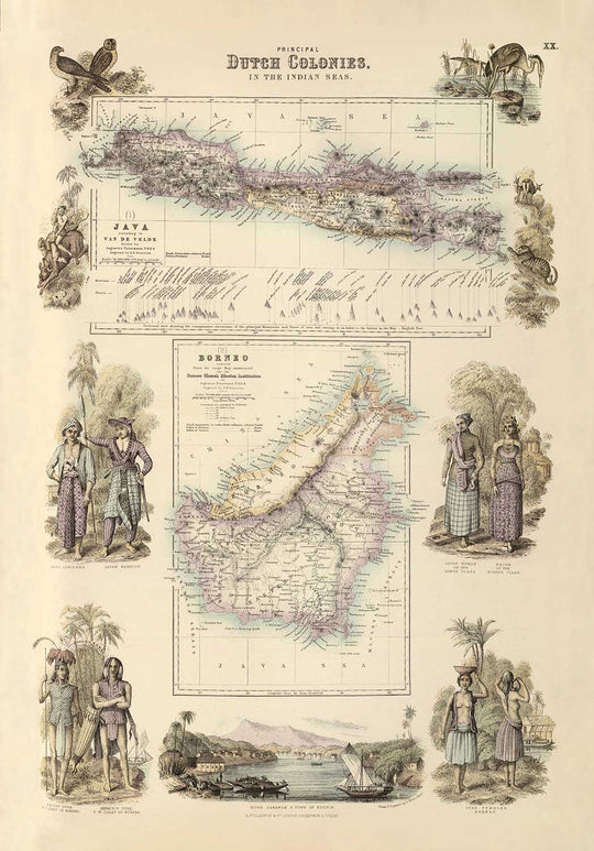 The map shows the island of Java and Borneo at the time of the Dutch East India Company's administration, with illustrations around the map displaying the scenery, wildlife and population of the islanders.