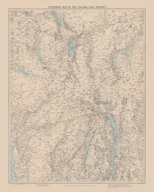 Stanford's Map of the English Lake District, crafted in 1899 by the esteemed cartographer Edward Stanford, is a masterful representation of one of England's most picturesque regions. This map, meticulously detailed and elegantly designed, captures the essence of the Lake District with its lakes highlighted in a serene shade of blue, while the surrounding terrain remains uncolored, emphasizing the natural beauty of the area. Spanning from Bassenthwaite Lake in the north to the southern tip of Lake Windermere, this map offers a comprehensive view of the region's geographical features.