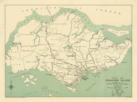 Old Map of Singapore Island, 1920: Roads, Railway, Sembawang, Tampines, Tuas, Johor Bahru, Malaysia