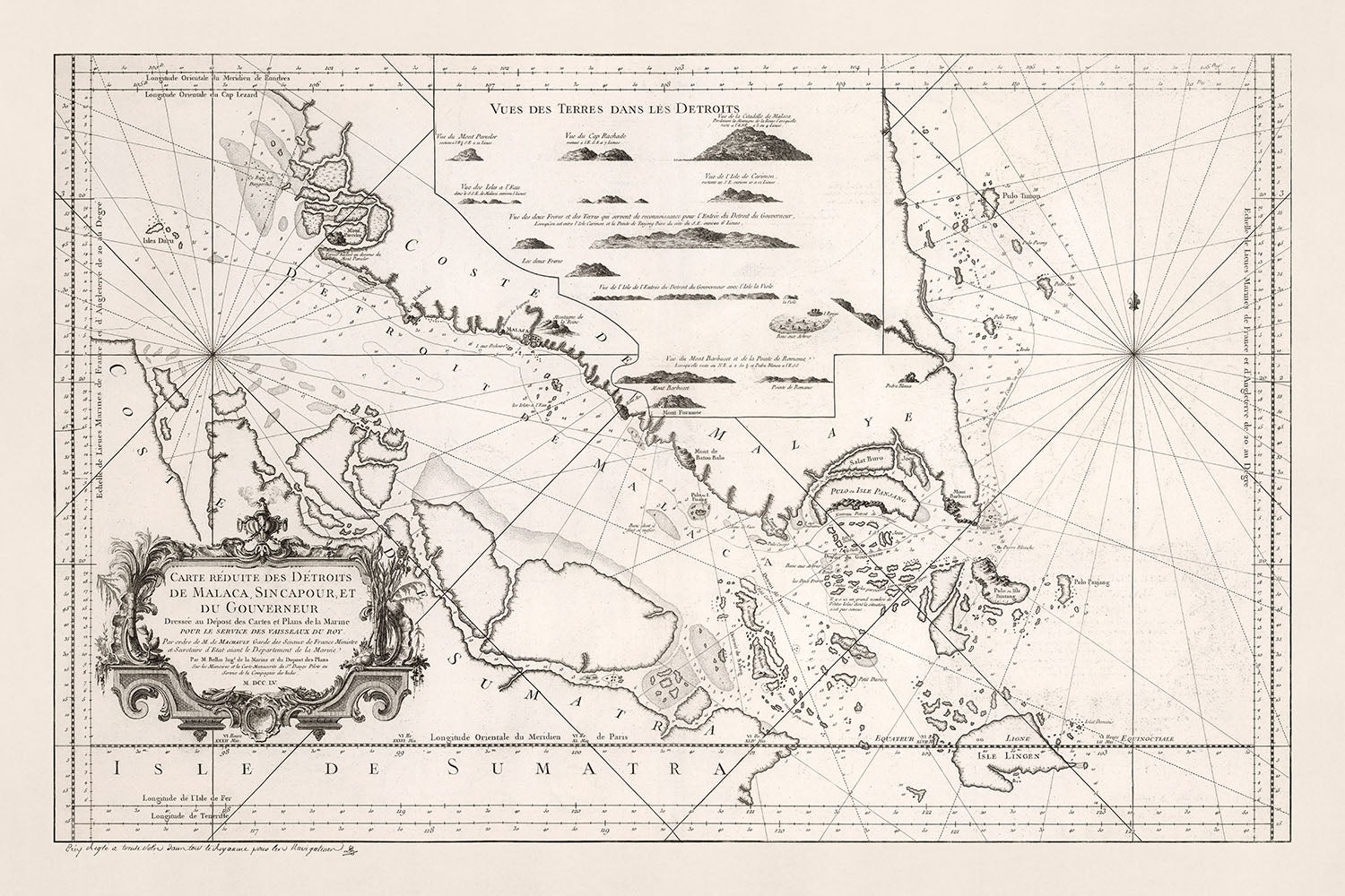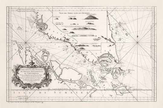 In conclusion, 'Carte Reduite des Detroits de Malaca, Sincapour, et du Gouverneur' is a historically informative map that offers valuable insights into the maritime history of Southeast Asia and the cartographic practices of the 18th century. It stands as a testament to Jacques Bellin's skill and the enduring appeal of naval charts. Whether viewed as a historical artifact, a work of art, or a tool of navigation, this map is a worthy addition to any collection.
