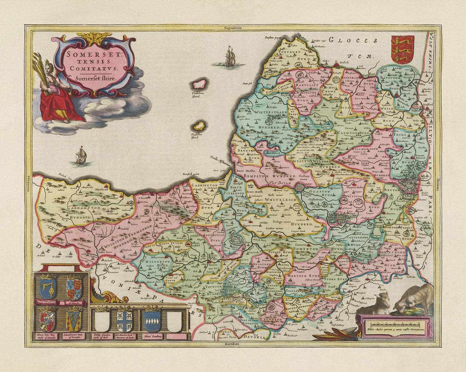 Old Map of Somerset in 1665 by Joan Blaeu: Bath, Bristol, Portishead, Weston-super-Mare, Taunton, Yeovil