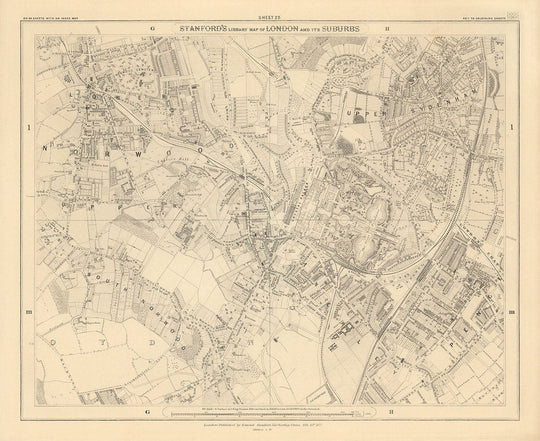 The map was originally published in 24 sheets. Altogether the map would've measured about 2 metres wide (78 inches). This here is sheet 23, which focuses on the southeast London boroughs of Croydon, Bromley, Lambeth Lewisham and Southwark.