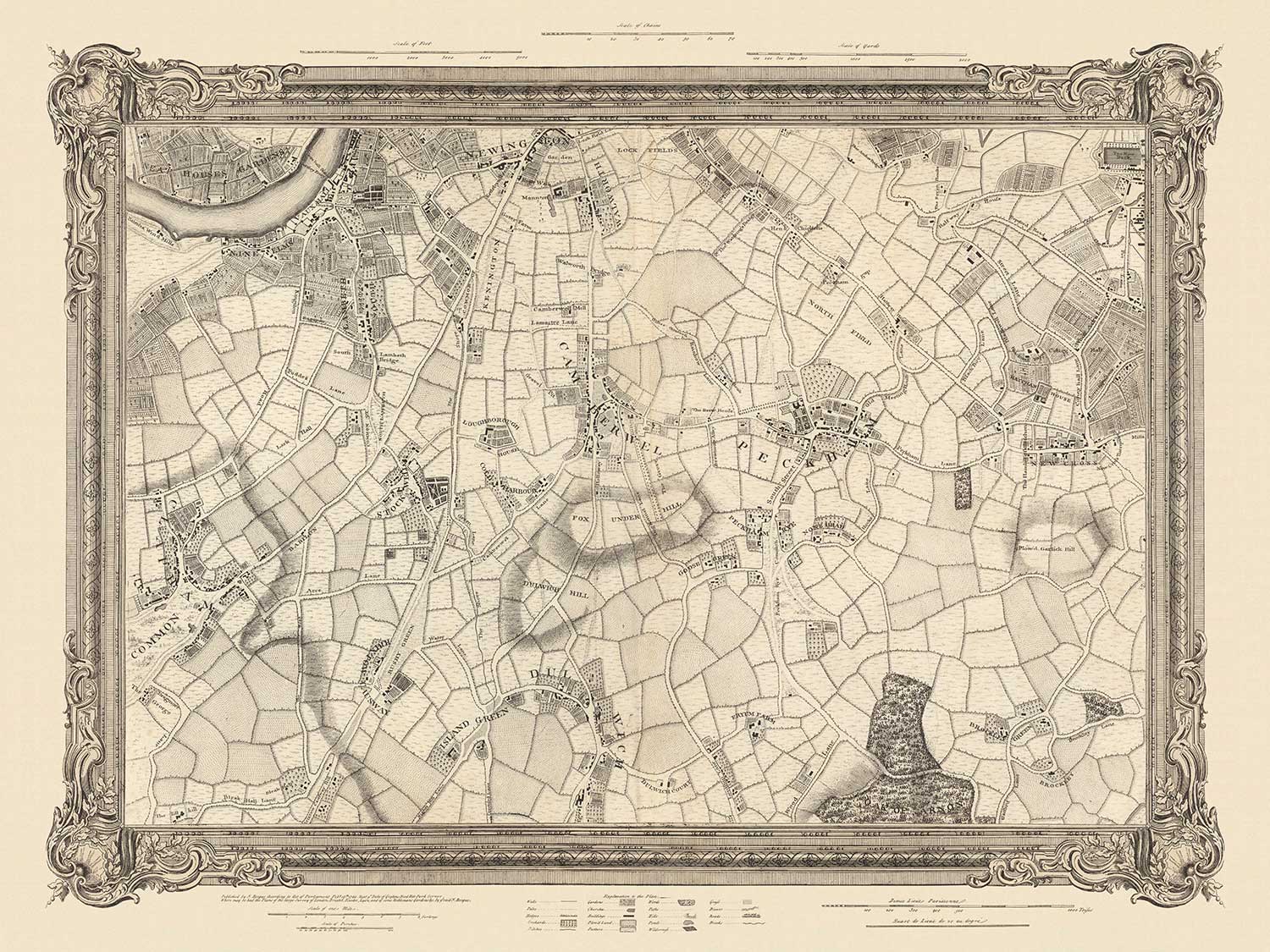 Published almost 300 years ago by master mapmaker John Rocque, this is the first detailed map of South East London and South London. It was originally published in 1746, following a highly accurate survey of London and its suburbs starting in 1740. It is a beautiful, highly detailed and extremely rare old map.