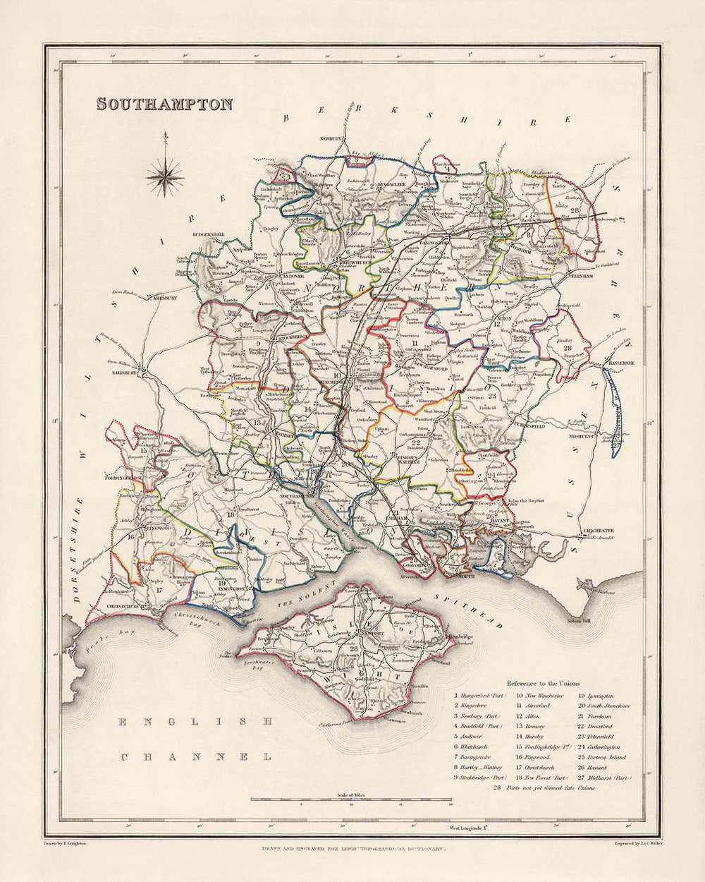 Old Map of the County of Southampton (Hampshire) by Samuel Lewis, 1844: Winchester, Portsmouth, Basingstoke