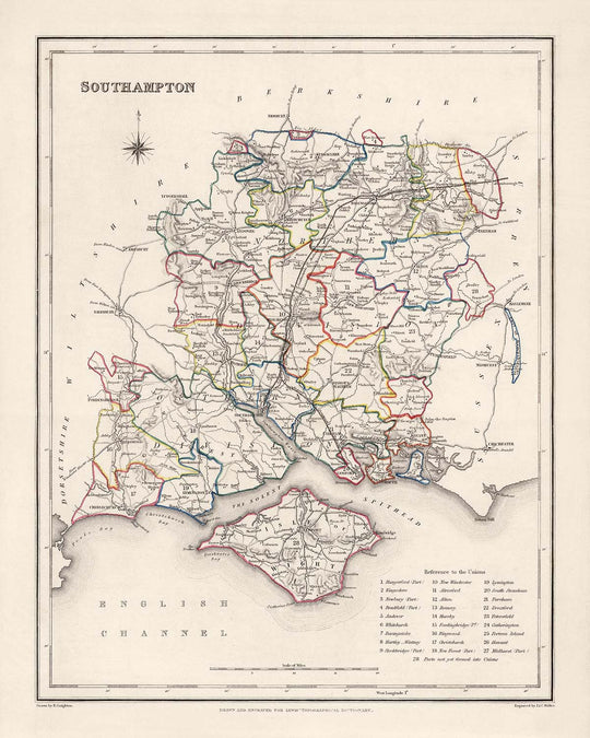 Owning this old map of the County of Southampton allows you to delve into the past and explore the historical boundaries, notable settlements, and natural features of this captivating region in England. It is a valuable piece for history enthusiasts, cartography aficionados, and anyone with an appreciation for the beauty and significance of old maps.