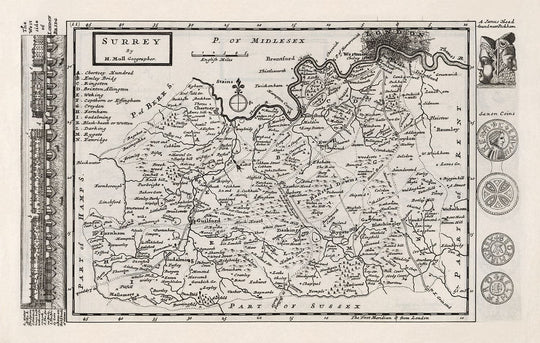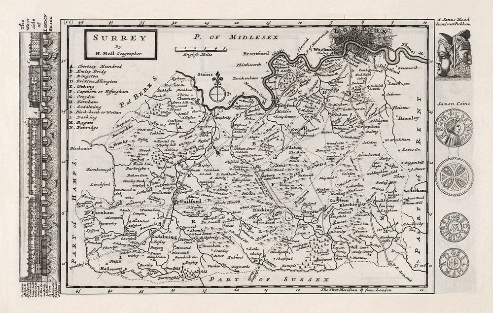 Moll's county maps are adorned with interesting views and curios - in this case, a detailed engraving of London Bridge on the left, some Saxon coins, and a Janus Head that was apparently found near Peckham.