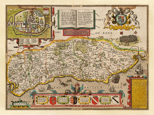 This old, full colour and wonderful map shows the ancient county of Sussex as it was in 1611. It was created by John Speed and engraved by Jodocus Hondius, and originally published in Speed's "The Theatre of the Empire of Great Britaine". The coat of arms of the Monarch of the United Kingdom appears in the top right, along with the Monarch's motto Dieu et mon droit - God and my right.