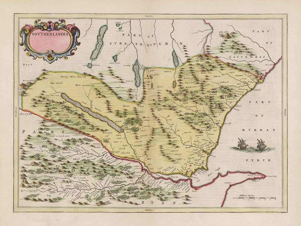 This exceedingly rare, old full colour map of the county of Sutherland in Scotland was created by master mapmaker Joan Blaeu from his workshop in Amsterdam and originally published in 1665 as part of his Theatrum Orbis Terrarum Sive Atlas Novus.
