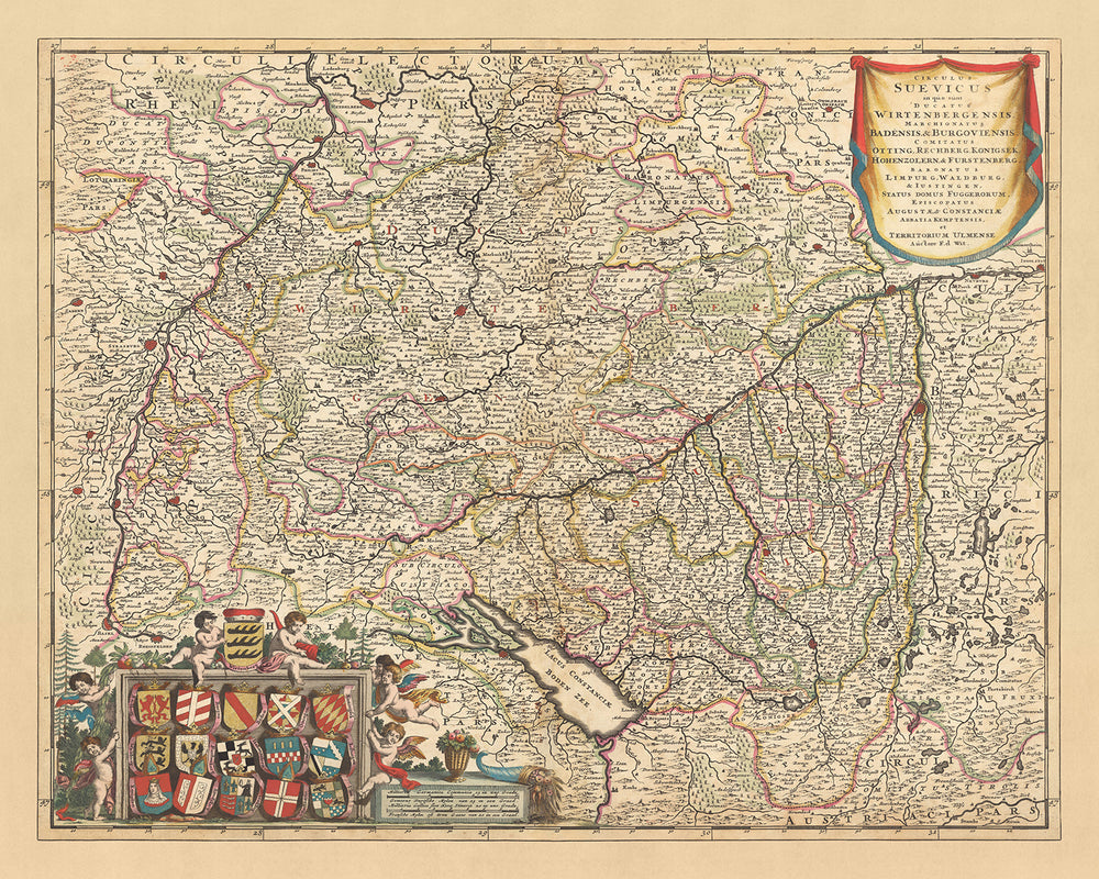 The map's full Latin title, 'Circulus Suevicus in quo sunt Ducatus Wirtenbergensis, Marchionatus Badensis et Burgoviensis Comitatus Otting et Territorium Ulmense', translates to 'Swabian Circle in which are the Duchy of Württemberg, the Margraviate of Baden and Burgau, the County of Oettingen, and the Territory of Ulm'. This title aptly describes the political divisions of the region during the late 17th century.
