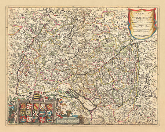 Immerse yourself in the intricate details of this remarkable 1690 map of the Swabian Circle, meticulously crafted by the renowned mapmaker Nicolaes Visscher II. This remarkable piece of history showcases not only the geographical prowess of the Dutch Golden Age, but also the political and cultural landscapes of the time. The Swabian Circle, known as 'Circulus Suevicus' in Latin, was an important Imperial Circle of the Holy Roman Empire, encompassing much of what is now modern-day southern Germany.