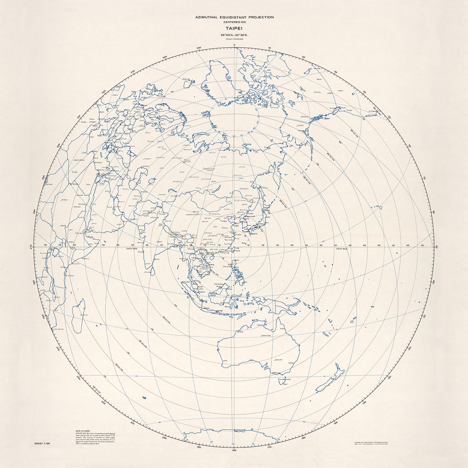 This map, created by the cartographers at the Central Intelligence Agency in 1968, showcases the city of Taipei using the Azimuthal Equidistant projection centered on the city.