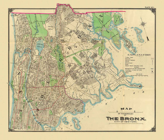 The birhtplace of hip-hop, this is a very detailed street map of the Bronx, two years after it was established as a borough in the City of Greater New York.