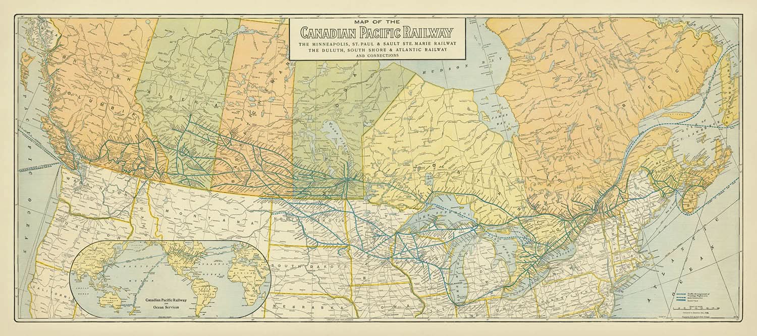 Old Map of the Canadian Pacific Railway by Poole Brothers, 1912: Canada and North USA, Great Lakes, Hudson Bay