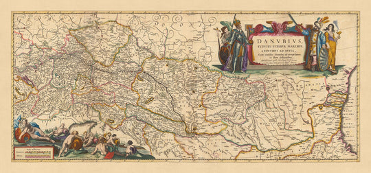 This exquisite map, 'Danubius Fluvius Europae Maximus, a Fontibus Ad Ostia : Cum omnibus Fluminibus, ab utroque latere, in illum defluentibus', was meticulously crafted by Nicolaes Visscher II in 1690. Translated from Latin, the title means 'The Danube, the Greatest River of Europe, from the Sources to the Mouths: With all the Rivers, on both sides, flowing into it'. This map is a testament to Visscher's cartographic skill and a reflection of the era's keen interest in geography and exploration.