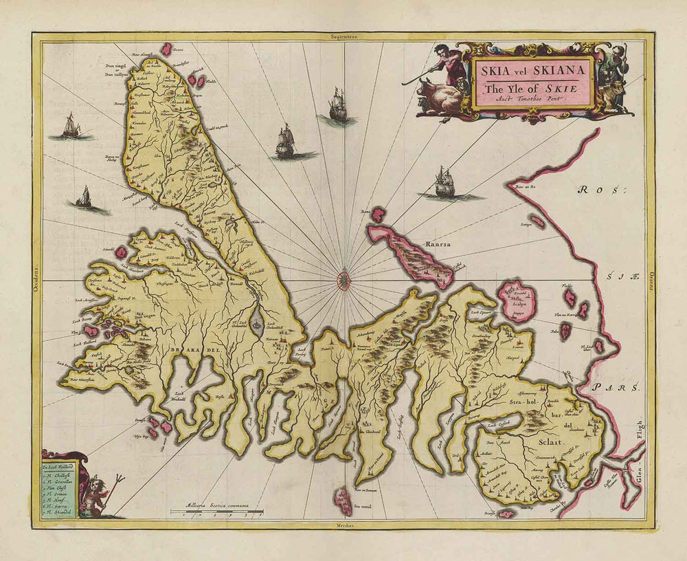 Old Map of the Isle of Skye in 1665 by Joan Blaeu: Portree, Raasay, Soay, Scalpay, Dunvegan