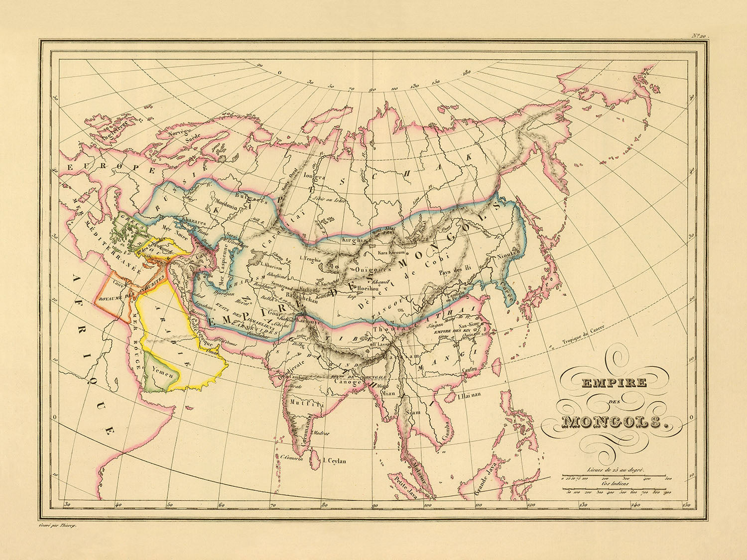 Old Map of the Mongol Empire by Malte-Brun, 1837: Karakorum, Persia, India, China