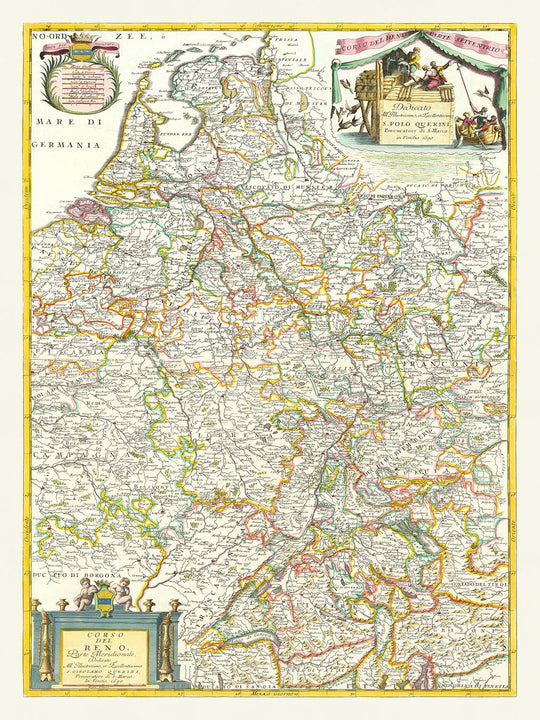 This map, titled 'Corso del Reno Parte Septentrio , Corso del Reno Parte Meridionale', is a detailed political and physical map of the Rhine River Basin, originally published in 1690 by Vincenzo Coronelli, a renowned Venetian cartographer, publisher, and globe maker. Coronelli's maps are highly sought after by collectors for their accuracy, detail, and decorative flourishes. This map is no exception, and it provides a fascinating glimpse into the geography and history of the region as it existed over three centuries ago.