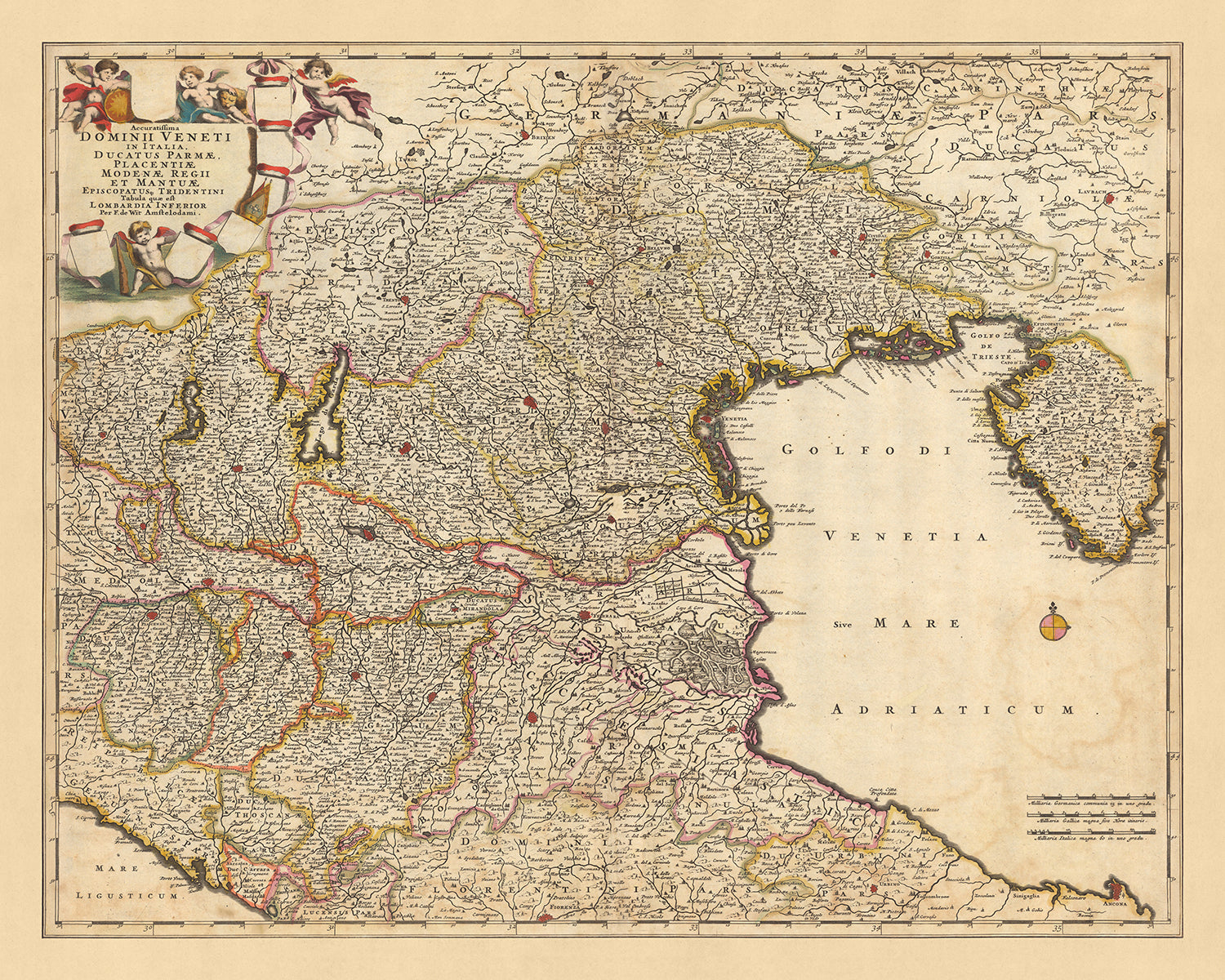Old Map of the Venetian Dominion by Visscher, 1690: Bologna, Florence, Venice, San Marino, Parco Alto Garda Bresciano