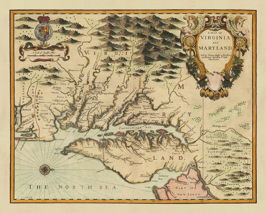 Old Map of Virginia & Maryland by John Speed, 1676: Jamestown, Yorktown, the Chesapeake Bay, and the Mason-Dixon Line