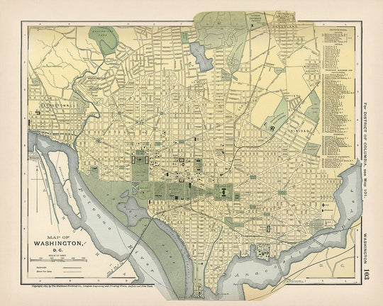 In essence, this map is more than just a geographical representation; it is a narrative of Washington, D.C.'s evolution, capturing the essence of a city that has been at the heart of American history. Its detailed depiction of streets, landmarks, and natural features offers a unique opportunity to explore the capital as it was over a century ago, making it a prized possession for historians and collectors alike.