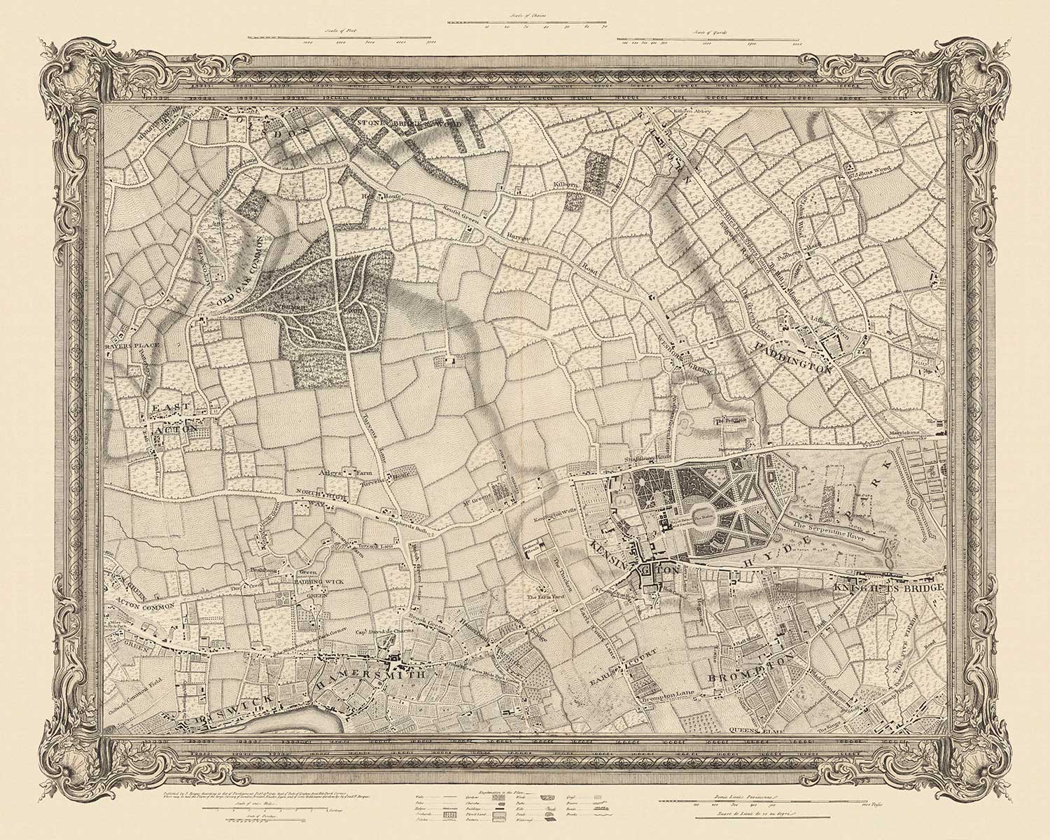 Old Map of West and Central London in 1746 by John Rocque: Hamersmith, Kensington, Hyde Park, Knightsbridge, Shepherd's Bush, SW3,SW5, SW7, W2, W6, W10, W12, W14, NW8