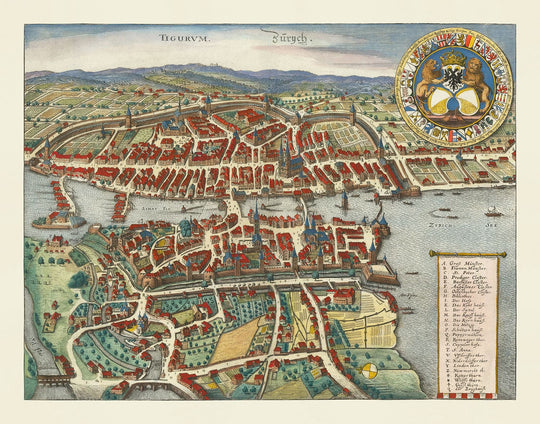 Old Map of Zurich, Switzerland 1638 by Matthaus Merian: Lake Zurich, Limmat River, Canals, Castle Walls, Coat of Arms