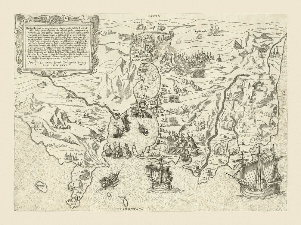 Old Military Map of the Conquest of Tunis by Zaltieri, 1566: La Goletta, Borgo Rabat, Carthage Ruins