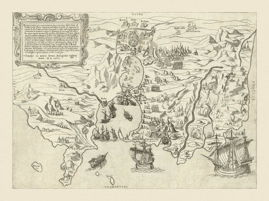 The artistry of Zaltieri is evident in the detailed illustrations of military encampments and naval battles, bringing to life the tension and drama of the siege. The map is based on the rare work of Agostino de Musi, offering a thematic portrayal of the Christian fleet's triumph. The depiction of powerful ships, such as the Portuguese galleon São João Baptista, highlights the naval prowess that was crucial in breaking the Ottoman stronghold. This map serves as a testament to the strategic maneuvers and alliances that defined this historic victory.