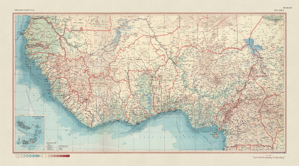 Old Map of West Africa, 1967: Political and Physical Map, Benin, Ivory Coast, Cameroon, Nigeria