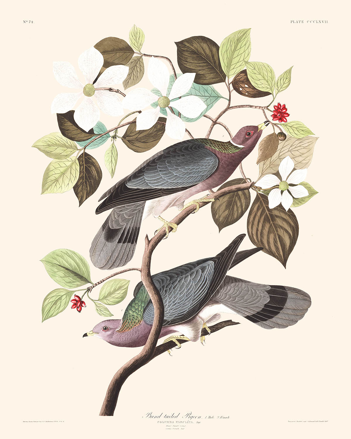 The use of color in this artwork is remarkable. The pigeons exhibit hues of light reddish-purple, greyish-blue, and metallic green, with delicate markings and detailed plumage. The composition, featuring the birds on an artfully illustrated branch, creates a sense of natural harmony and elegance. Audubon's ability to blend scientific accuracy with aesthetic beauty is what makes his work timeless and appealing.