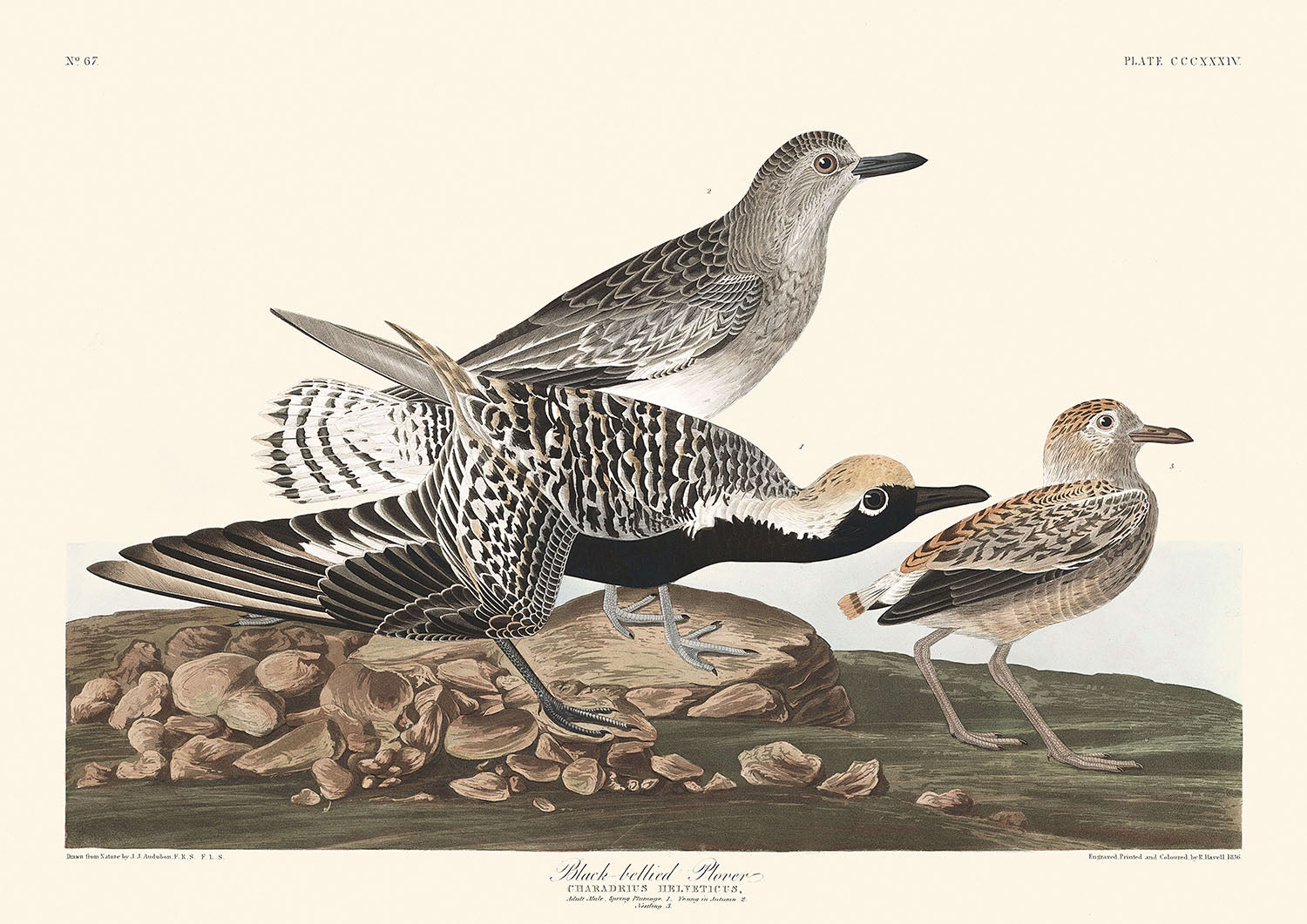 The "Black-bellied Plover (Plate 334)" by John James Audubon, first published in 1827, is a stunning illustration from Audubon’s renowned series, The Birds of America. This exquisite bird study captures the beauty and essence of the Black-bellied Plover amid its natural habitat.