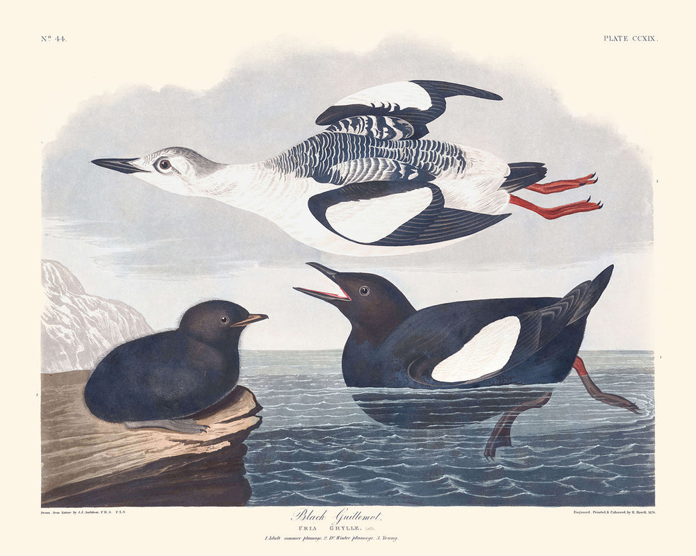 With its deep blacks tinged with green and vivid red highlights, the Black Guillemot illustration epitomizes Audubon's talent for capturing color and detail. Whether you’re an art lover, a bird enthusiast, or someone who appreciates historical artwork, this piece adds a touch of refined nature to any space.