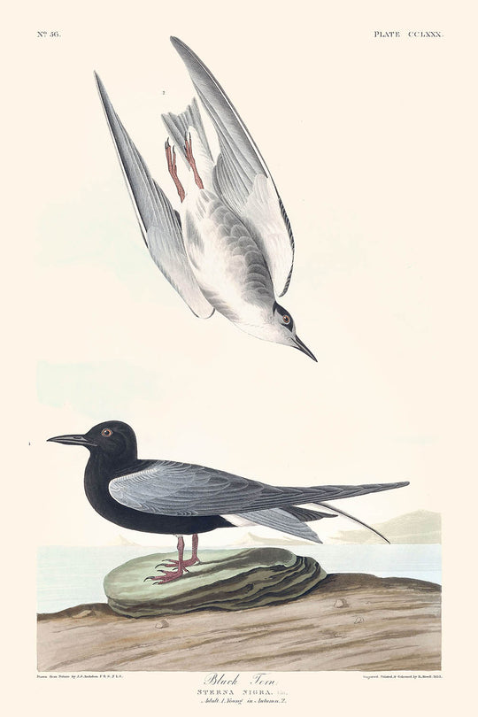 The Black Tern illustration is particularly notable for its dynamic portrayal of the bird in motion, highlighted by the use of subtle greys, blacks, and whites that bring the bird's plumage to life. The graceful composition and the delicate depiction of the environment make this piece stand out among Audubon's works. Placing this print on your wall will not only bring a touch of nature indoors but also serve as a conversation starter about the rich history of ornithology and art.