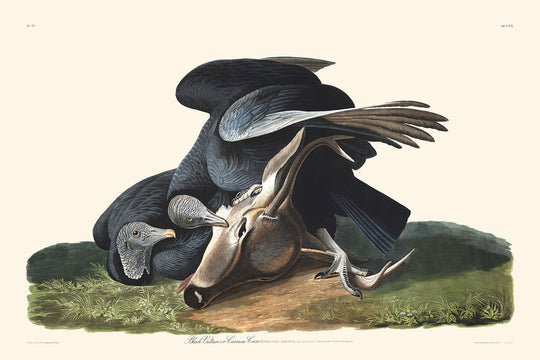 "Black Vulture (Carrion Crow)" transports us into the vibrant and intricate world of John James Audubon's "Birds of America." First published in 1827, this illustration captures the essence of the Black Vulture, a bird as mysterious as it is ubiquitous across the southern states of America.