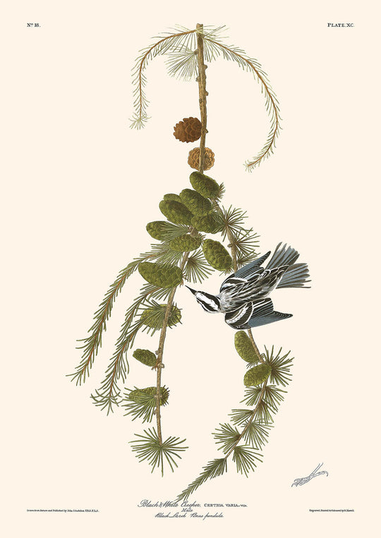 The Black-and-white Creeper itself is fascinating for its distinctive climbing habits and its striking black and white plumage. It can be found across various regions, from Louisiana to Canada, and is known for its rapid movement along the trunks and branches of trees. Audubon's illustration captures the bird in motion, demonstrating its unique feeding and nesting behaviors.