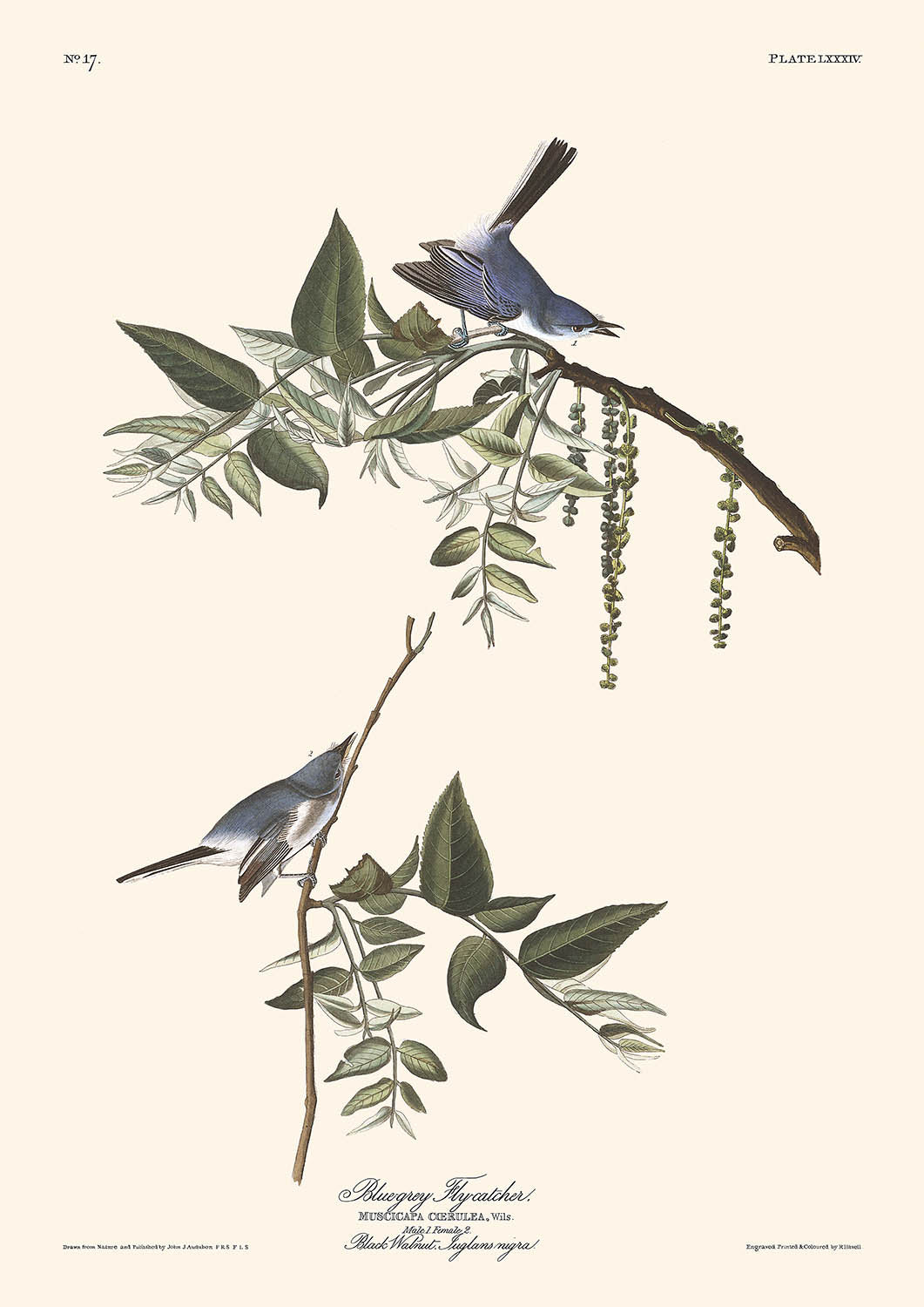 The Blue-Grey Flycatcher is notable for its role as a foster parent to the young of the Cow Bunting and its agile flight patterns as it hunts for insects. Audubon's illustration beautifully showcases the bird amidst the branches of a black walnut tree, providing a detailed backdrop that adds to the charm of the piece. The use of color—bright blues and soft greys—along with the intricate depiction of the bird’s plumage and behavior, captures a moment of natural elegance and vibrancy.