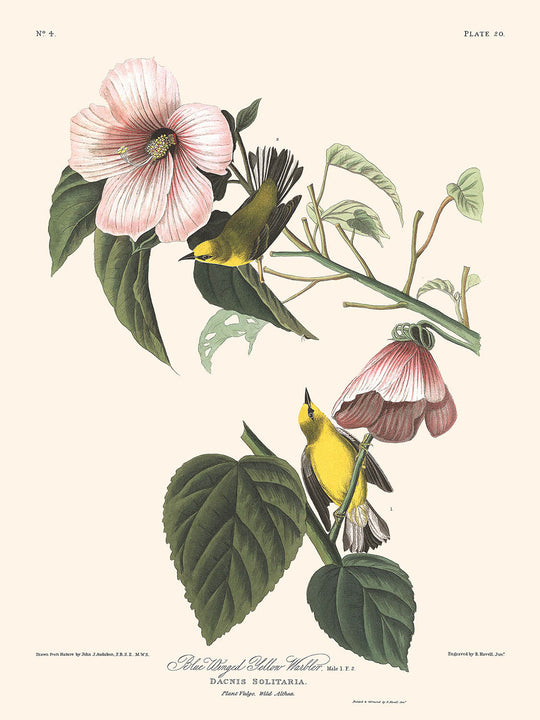 Immerse yourself in the delicate beauty of "Blue-winged Yellow Warbler," an exquisite illustration by John James Audubon, first published in 1827. This enchanting depiction of a pair of Blue-winged Yellow Warblers amongst a large-flowered Hibiscus from Audubon's seminal work, "The Birds of America," emanates the serenity of the natural world through its intricate artistry.