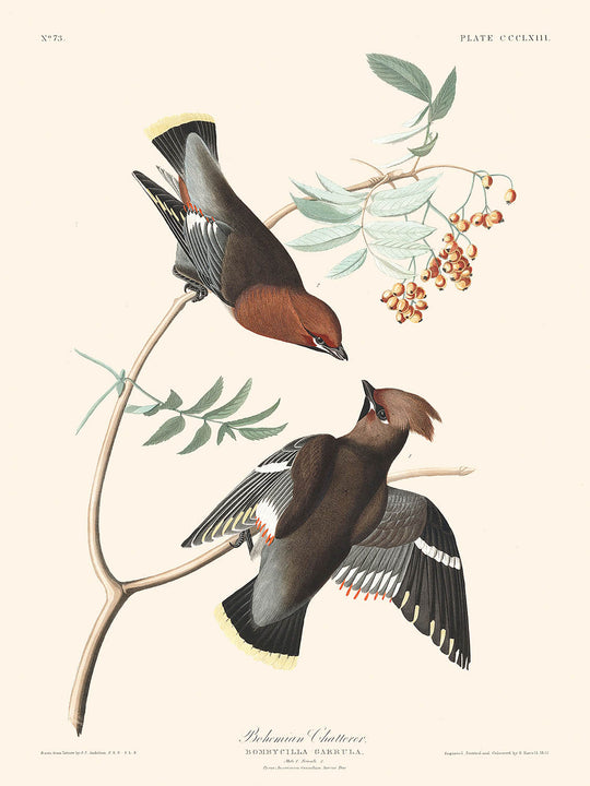 The Bohemian Chatterer, or Bombycilla garrula, is known for its striking plumage and unique migratory patterns. Audubon’s depiction is notable for the bird's rich greyish-brown colouring that transitions into ash-grey and brownish-orange, with highlighted primary quills tipped in bright yellow and red wax-like appendages. The scene is as much informative as it is aesthetically captivating, illustrating the bird's natural grace and intricate details with precision.