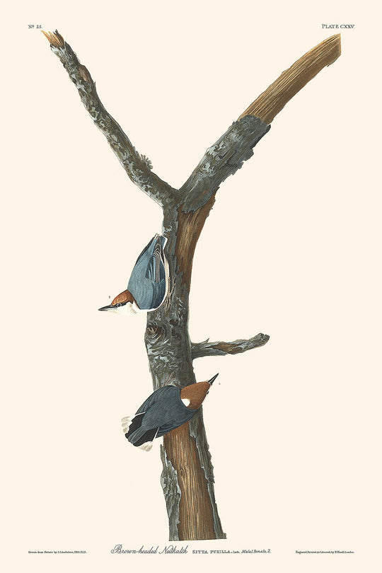 The "Brown-headed Nuthatch" (Plate 125) is an exquisite bird illustration by the renowned naturalist and artist John James Audubon. This artwork is a part of Audubon’s celebrated series, "Birds of America," originally published in 1827. The print captures the lively essence of the Brown-headed Nuthatch, a bird recognized for its energetic movements and distinct calls, primarily found in the pine woodlands of the Southern United States.