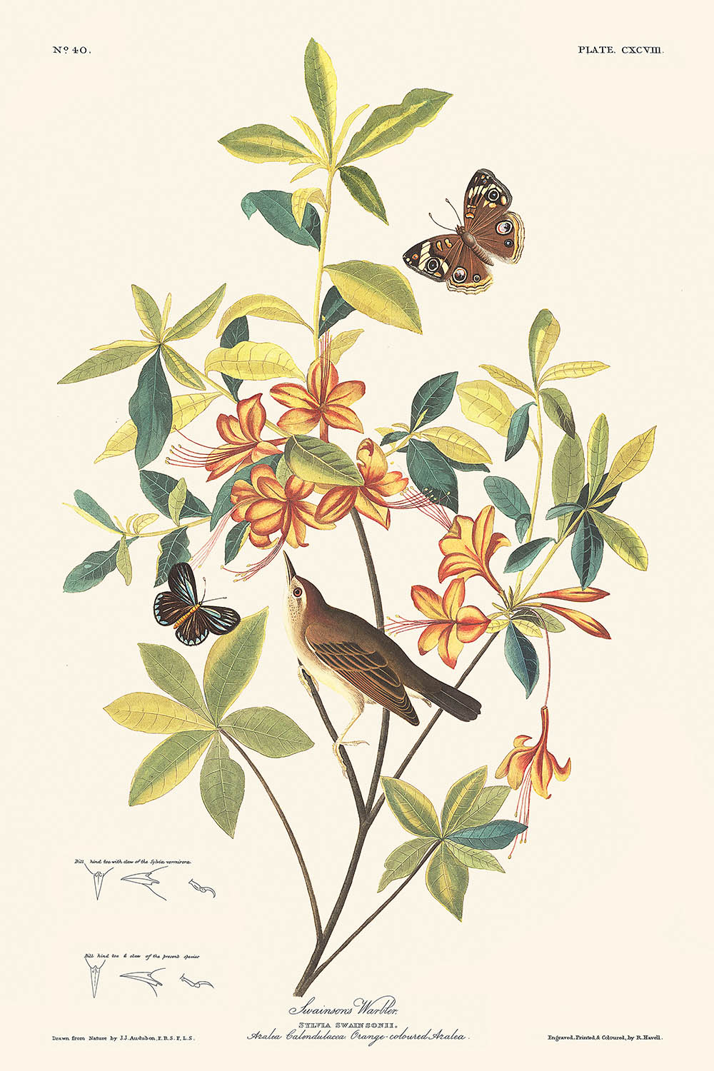 Brown-headed Worm-eating Warbler (Plate 198), first published in 1827, is one of the meticulously detailed bird illustrations from John James Audubon’s unparalleled series, The Birds of America. Showcasing a delicate brown-headed warbler, this piece represents both Audubon’s unwavering dedication to ornithology and the incredible biodiversity of early 19th century America.
