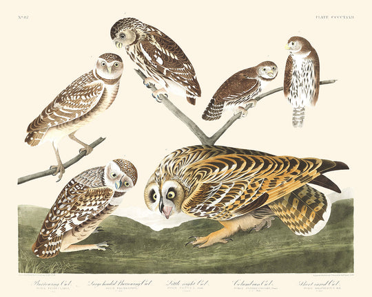 Burrowing Owl, Large-headed Burrowing Owl, Little night Owl, Columbian Owl, Short-eared Owl (Plate 432), first published in 1827, is one of the detailed and fascinating illustrations from John James Audubon's renowned work, The Birds of America. This exceptional piece captures the unique appearances and behaviors of various owl species in stunning detail.
