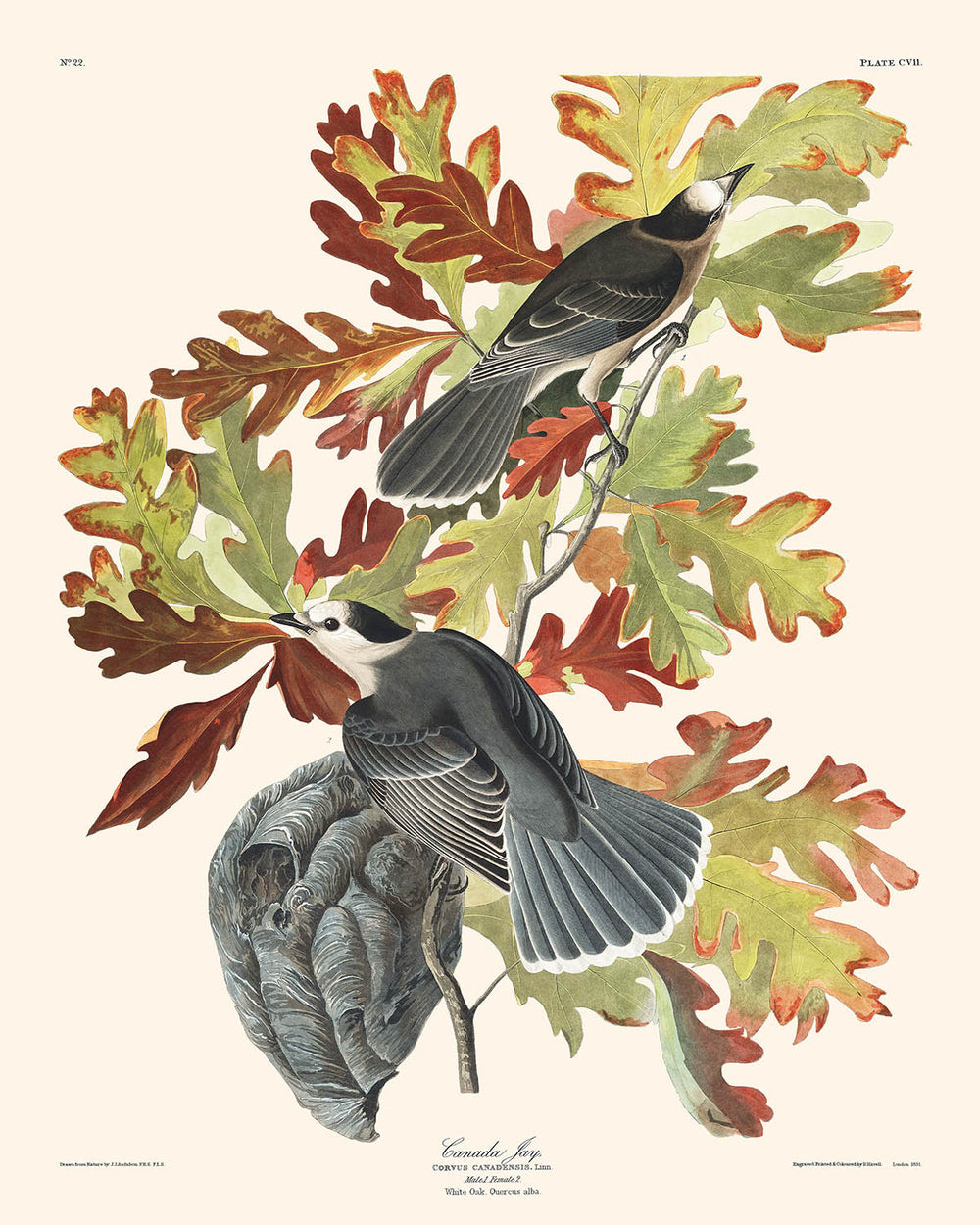 Behold the Canada Jay (Plate 107), a captivating illustration brought to life by the esteemed naturalist and painter, John James Audubon. First published in 1827 as part of Audubon's monumental work, The Birds of America, this piece captures the essence and intricate beauty of the Canada Jay in its natural habitat.