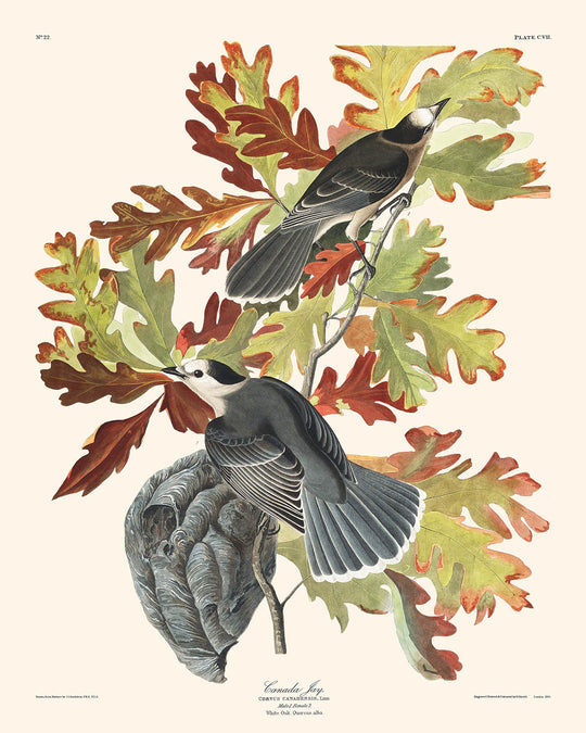 The Canada Jay's dynamic presence, fearless nature, and interesting behaviours, as described by Audubon, make this print an invaluable addition to any home. The bird's tendency to interact boldly with humans, even venturing into their camps, adds a layer of charm and curiosity to this illustration. The detailed background, featuring autumnal oak leaves, adds a splash of colour and seasonality, enhancing the artisanal quality of the print.