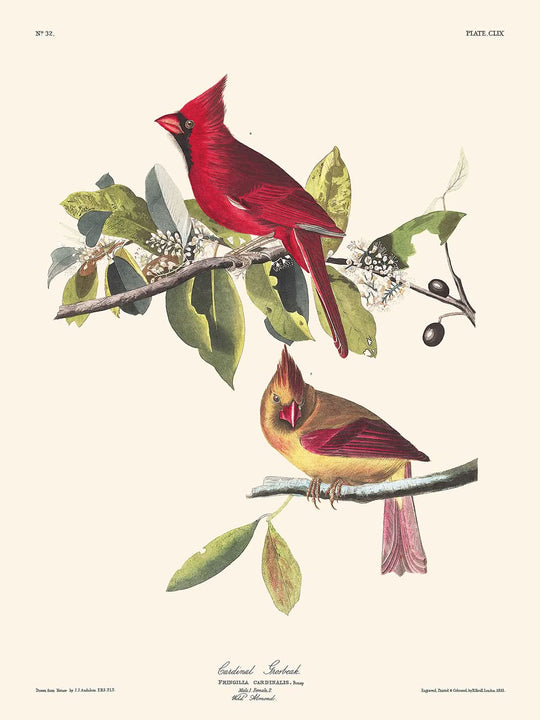 The "Cardinal Grosbeak," first published in 1827, is a stunning and vibrant illustration by John James Audubon from his acclaimed series, Birds of America. This artwork captures the rich colors and dynamic posture of the cardinal, celebrated for its vibrant plumage, exceptional song, and widespread presence across the United States.