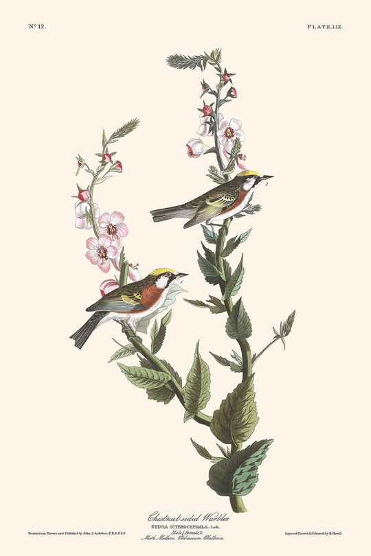 The "Chestnut-sided Warbler" plate stands as a notable example of Audubon's vibrant style and attention to detail. The artwork portrays the bird’s striking plumage with vivid yellows and chestnut hues set against a delicate backdrop of the Moth Mullein plant. Audubon’s narrative description transports the viewer into a rare Pennsylvania morning, creating an evocative connection with an elusive species that sparked Audubon’s curiosity and wonder.
