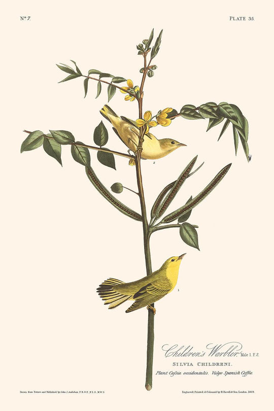 The color palette employed by Audubon in "Children's Warbler" is vibrant yet harmonious, capturing the bird's natural habitat with shades of green, yellow, and muted browns. The pristine detail and lifelike proportions evoke a sense of being amidst nature, making it a wonderful print to enrich any space with elegance and charm. Owning this print invites not only artistic admiration but also a deeper appreciation for the wonders of nature.