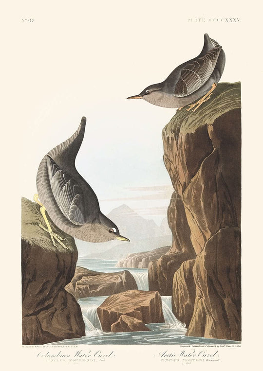 Columbian Water Ouzel, or Arctic Water Ouzel, first published in 1827, is an exquisite bird illustration by John James Audubon, part of his renowned collection, The Birds of America. This masterpiece showcases Audubon's dedication to capturing the intricate beauty and diversity of North American bird species.