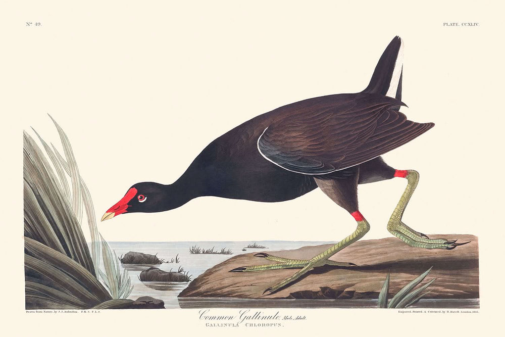 Step into the vibrant world of ornithology with John James Audubon’s "Common Gallinule," first published in 1827 as part of his renowned series, Birds of America. This intricate bird illustration captures the striking details and hues of the Common Gallinule, offering a vivid portrayal of a creature both abundant and elusive in the southern United States.