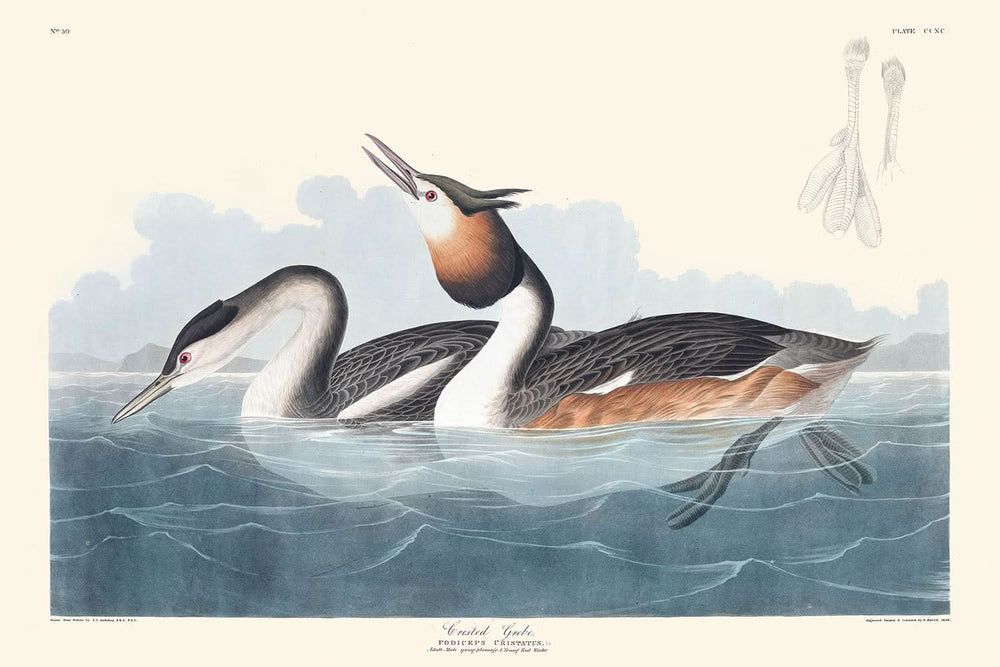 Crested Grebe by John James Audubon is a magnificent illustration from the esteemed Birds of America series, published in 1827. This piece encapsulates the beauty and essence of the Crested Grebe, a captivating bird renowned for its exquisite plumage and graceful movements.