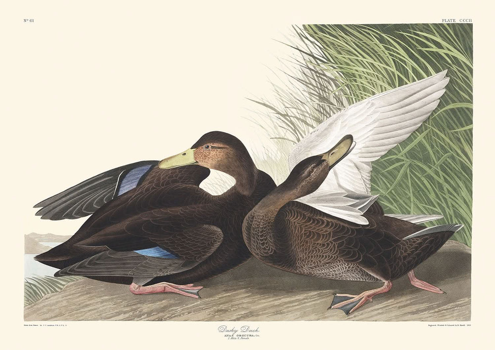 In Audubon's illustration, the interplay of natural colors and refined detailing uniquely highlights the plumage of the Dusky Duck. His use of soft, deep brown hues in the feathers, set against a dynamic, naturalistic backdrop, transports viewers into the serene environments these ducks inhabit. This print not only adds natural beauty to any space but also serves as a conversation starter about the diversity and splendor of avian life.